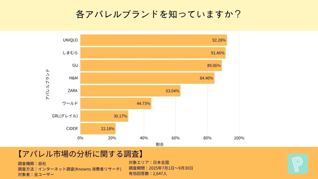 続くH&M(84.40%)、ZARA(63.04%)も一定の認知を獲得している一方で、ワールド(44.73%)GRL(30.17%)やCIDER(22.18%)は全体ではまだ“知る人ぞ知るブランド”というポジションにとどまっています。