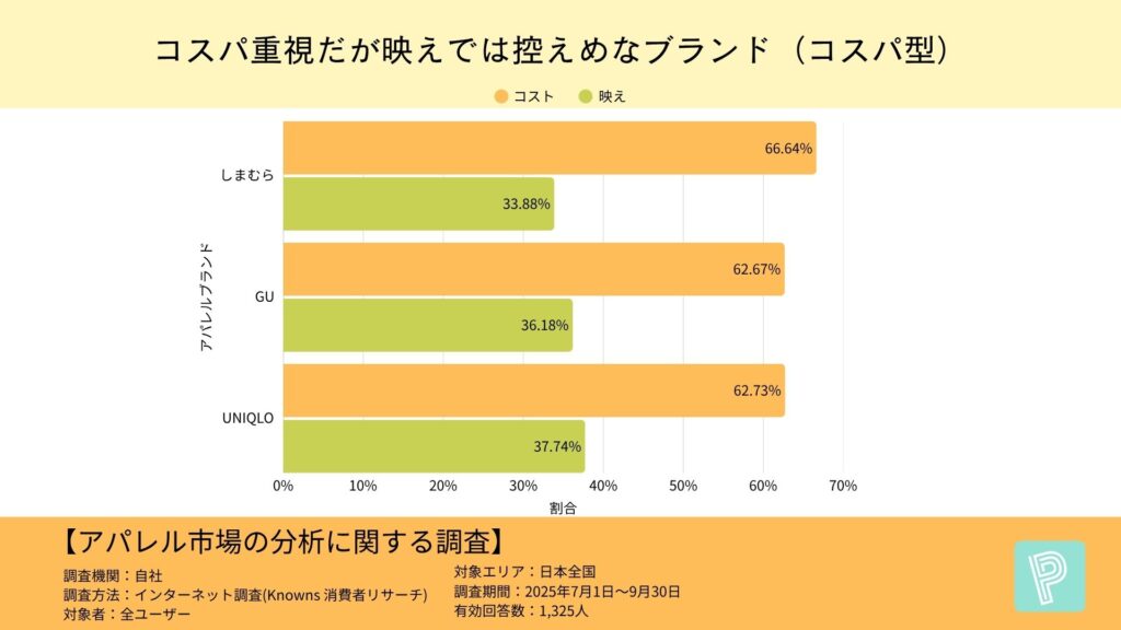しまむら(コスパ66.64%/映え33.88%)、GU(62.67%/36.18%)、UNIQLO(62.73%/37.74%)が、「コスパが良い」と感じる割合が平均を大きく上回る一方、「映え」評価は控えめという結果に。