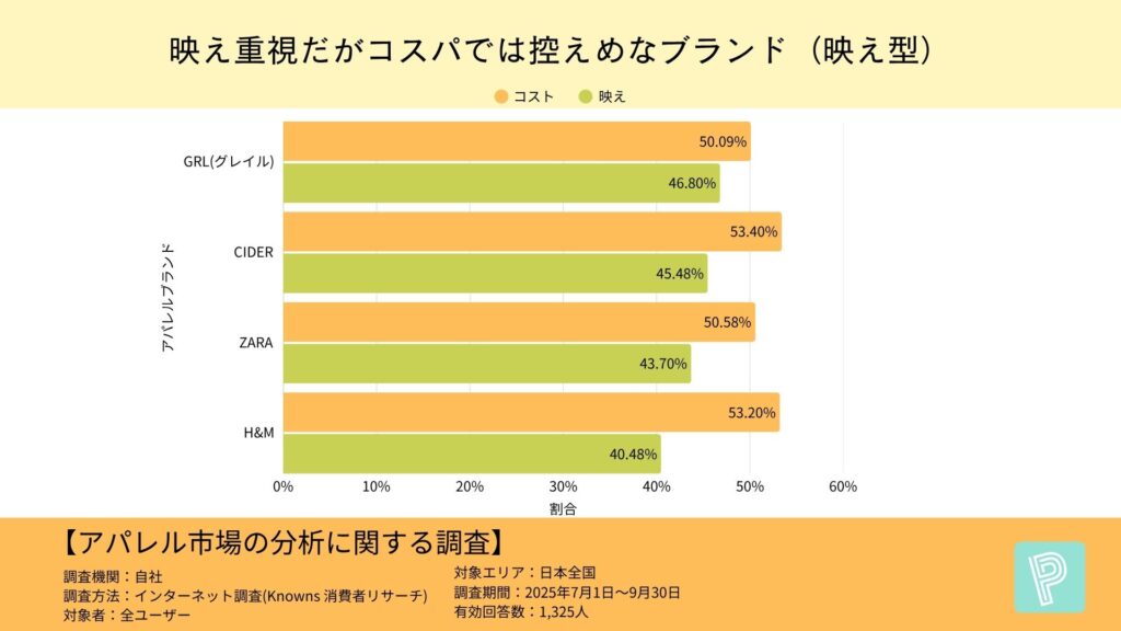 「コスパよりも映えを優先するブランド」として注目されたのは、CIDER(映え45.48/コスパ53.40%)、GRL(46.8%/50.09%)、ZARA(43.7%/50.58%)、H&M(40.48%/53.2%)の4ブランド。