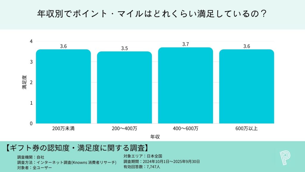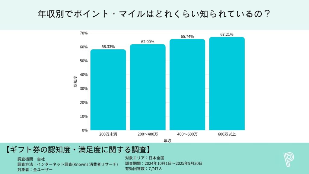 年収が高いほどポイント・マイルの認知度が高い傾向が確認でき、年収200万未満と年収600万以上の認知度の開きがおおよそ10%になります。