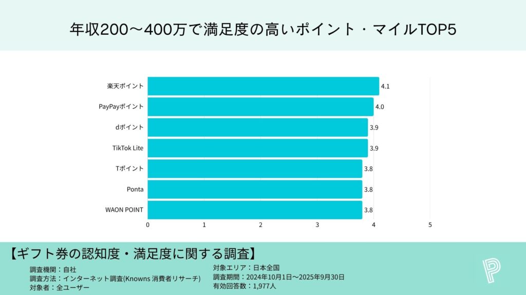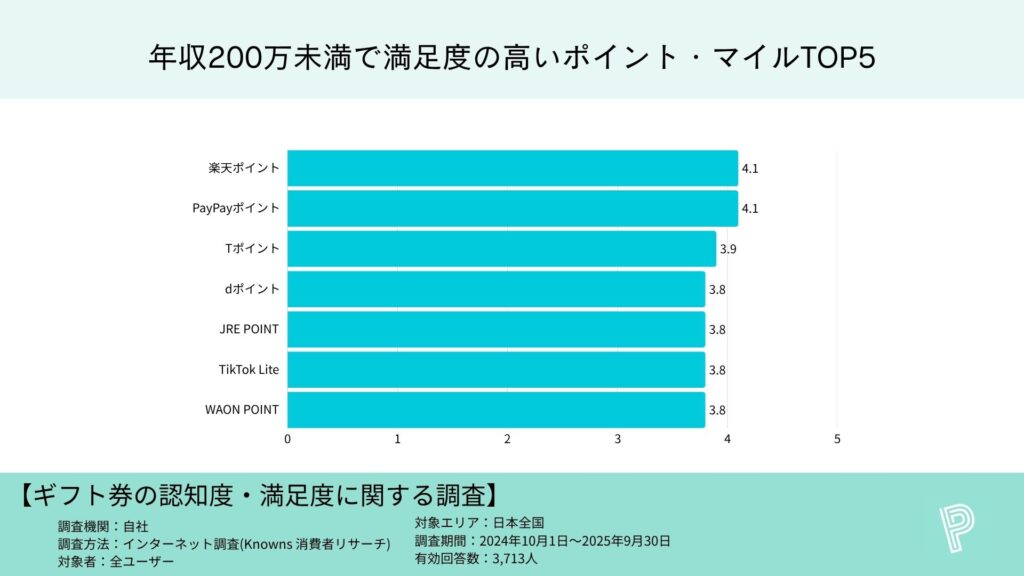 年収200万円未満:楽天ポイント4.1、PayPayポイント4.1、Tポイント3.9、dポイント3.8、JRE POINT・TikTok Lite・WAON POINTが各3.8(同率)