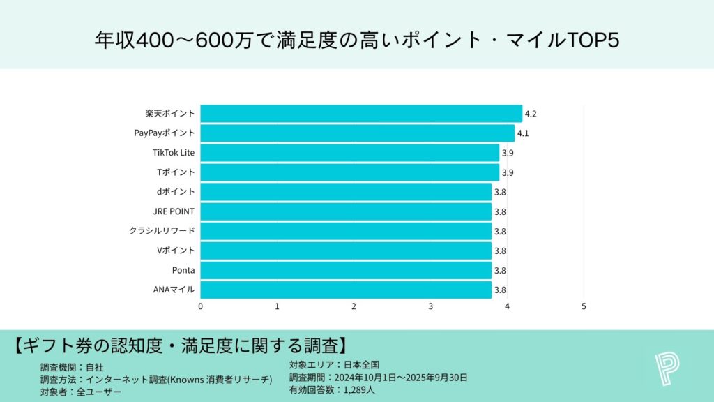 年収400~600万円:楽天4.2、PayPay4.1、TikTok Lite・T各3.9、d・JRE POINT・クラシルリワード・Vポイント・Ponta・ANAマイルが各3.8(同率)。